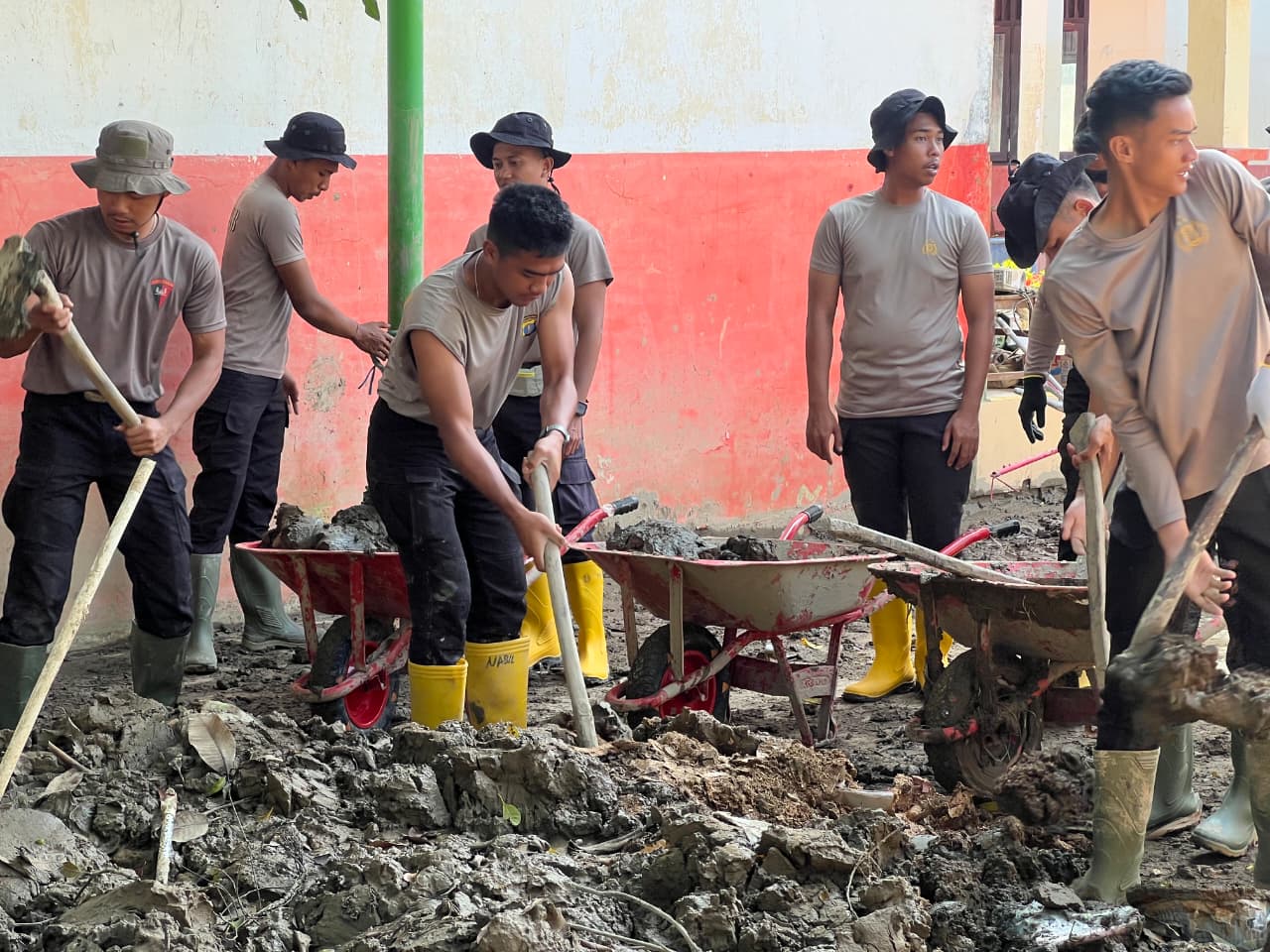 Rangkaian kegiatan diawali dengan pelaksanaan apel gabungan di lapangan apel Mapolres Lhokseumawe yang dipimpin langsung oleh Kabagops Polres Lhokseumawe, Kompol M. Abdi Hendriyatna, S.I.K., M.H. Setelah apel, personel segera melaksanakan pergeseran pasukan (Serpas) menuju ploting wilayah pembersihan di SDN Negeri 8 Muara Batu yang terletak di Jalan Pendidikan No. 2, Desa Cot Seurani, Kecamatan Muara Batu. Di lokasi tersebut, personel Brimob Kaltim berjibaku membersihkan tumpukan lumpur, sampah, hingga mengevakuasi bekas pohon tumbang yang menutupi akses sekolah. Kerja keras para personel ini bertujuan untuk mengembalikan kenyamanan lingkungan sekolah bagi para siswa dan tenaga pengajar.