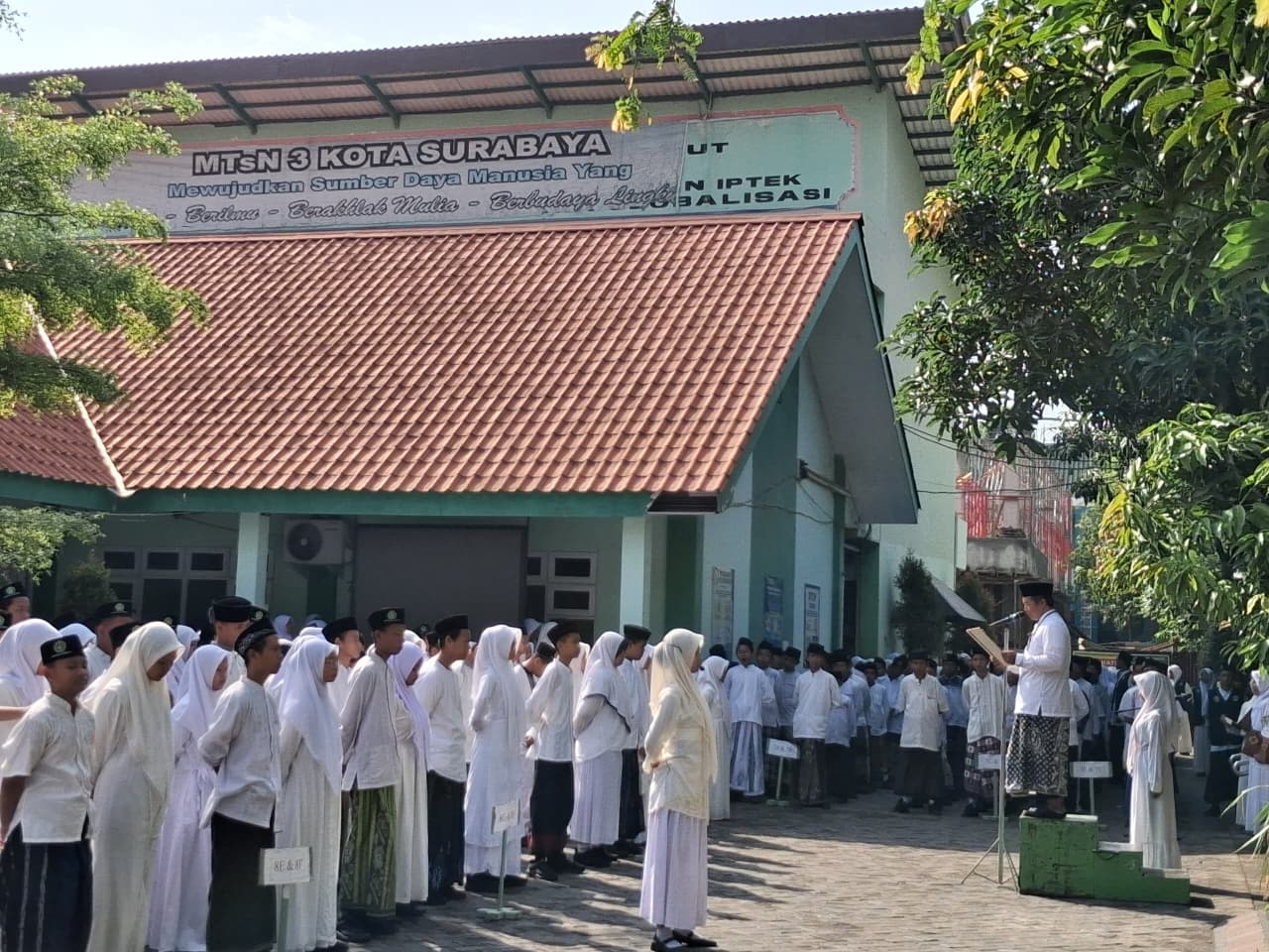Faktanusa.com, Surabaya, 22 Oktober 2025 – MTsN 3 Kota Surabaya menggelar apel peringatan Hari Santri Nasional di halaman madrasah dengan penuh khidmat dan semangat kebangsaan. Kegiatan ini diikuti oleh seluruh siswa kelas VII dan VIII, dewan guru, serta tenaga kependidikan madrasah. Para peserta apel mengenakan busana muslim putih serta sarung dan peci bagi putra, dan gamis serta kerudung putih bagi putri.
