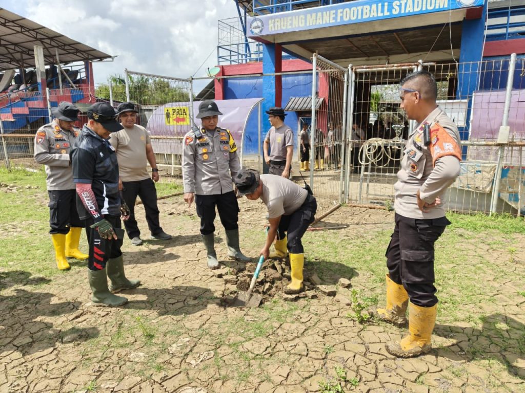Kegiatan tersebut dipimpin langsung oleh Komandan Kompi Penugasan, AKP Elan Suherlan, S.H., sebagai bagian dari upaya percepatan pemulihan fasilitas publik yang terdampak bencana. Stadion Krueng Mane yang merupakan salah satu sarana olahraga kebanggaan masyarakat setempat diketahui tertutup lumpur tebal akibat banjir bandang yang melanda wilayah tersebut beberapa waktu lalu.