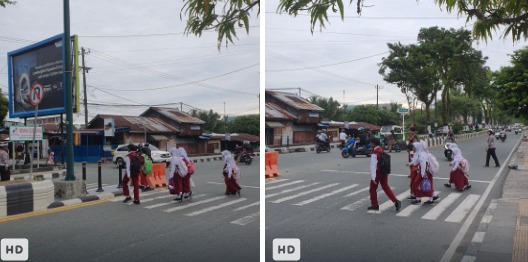 Dengan sigap, personel Brimob menghentikan sejenak laju kendaraan dan mengamankan jalur penyeberangan. Hal ini dilakukan untuk memastikan para siswa dapat menyeberang jalan dengan aman dan tertib saat hendak memasuki lingkungan sekolah. Kehadiran anggota Brimob di lokasi tersebut memberikan rasa aman bagi para pelajar dan orang tua yang mengantar.