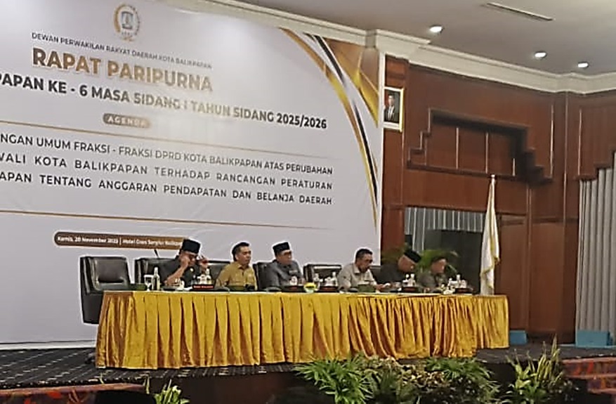 Faktanusa.com, Balikpapan – Dewan Perwakilan Rakyat Daerah (DPRD) Kota Balikpapan menggelar Rapat Paripurna ke-6 Masa Sidang I Tahun 2025/2026 dengan agenda penyampaian pemandangan umum fraksi-fraksi terhadap Perubahan Nota Penjelasan (Nopen) Wali Kota Balikpapan atas Rancangan Peraturan Daerah (Raperda) Anggaran Pendapatan dan Belanja Daerah (APBD) Tahun 2026. Rapat berlangsung di Hotel Grand Senyiur Balikpapan, Kamis (20/11/2025).