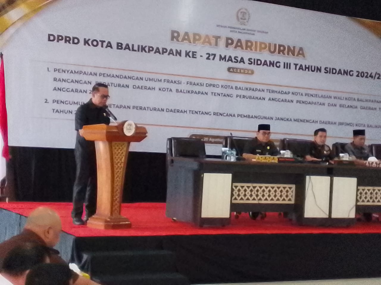 Faktanusa.com, Balikpapan – DPRD Kota Balikpapan menggelar Rapat Paripurna ke-27 Masa Sidang III Tahun Sidang 2024/2025 dengan agenda penyampaian pemandangan umum fraksi-fraksi terhadap nota penjelasan Wali Kota Balikpapan atas Rancangan Peraturan Daerah (Raperda) tentang Anggaran Pendapatan dan Belanja Daerah (APBD) Perubahan Tahun 2025. Rapat berlangsung di Aula Gedung Parkir Klandasan, Rabu (20/8).