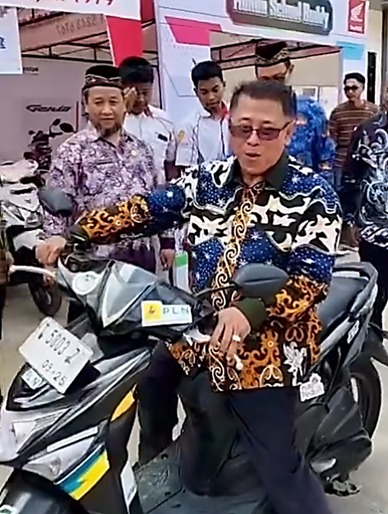 Foto : Sigit Wibowo saat menghadiri HUT SMK Negeri 6 Balikpapan, dan mencoba hasil karya anak Bangsa dengan trobosan motor roda dua dengan bahan bakar bensin menjadi Motor Listrik