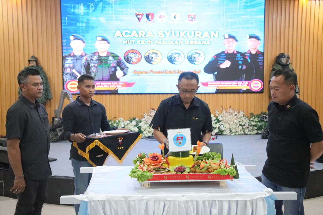 Rangkaian kegiatan diisi dengan doa bersama, pemotongan tumpeng, serta penyampaian pesan motivasi untuk memperkuat semangat pengabdian para personel. Seluruh rangkaian acara berlangsung hangat dan penuh rasa bangga, mencerminkan kuatnya ikatan dan komitmen internal dalam menjaga marwah Gegana sebagai satuan elit yang siap siaga menghadapi segala bentuk ancaman.