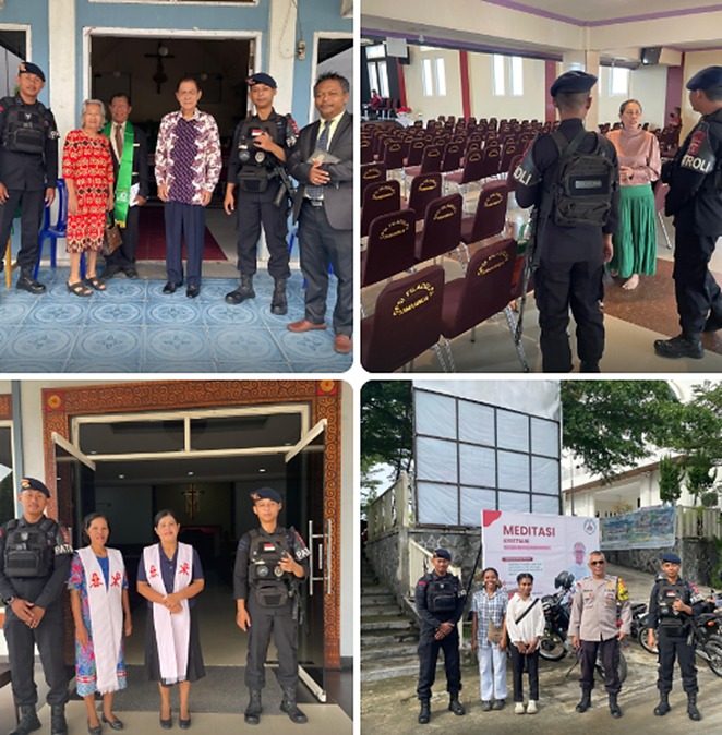 Pada kegiatan tersebut, personel Brimob melakukan pengecekan area gereja, pemantauan situasi sebelum dan sesudah ibadah, serta berkoordinasi dengan pengurus gereja untuk memastikan keamanan tetap terjaga. Personel juga memberikan imbauan kamtibmas agar jemaat tetap waspada dan bersama-sama menjaga lingkungan sekitar.