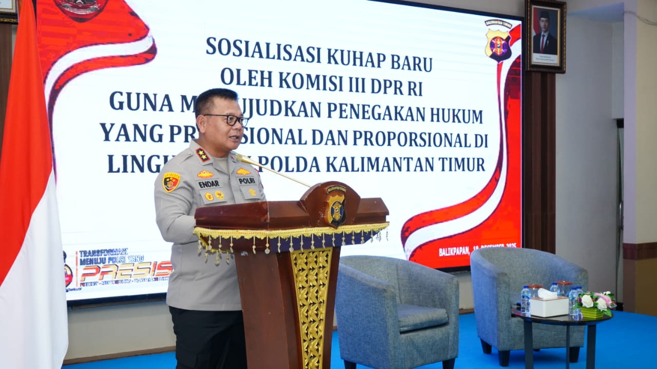 Kegiatan sosialisasi ini dihadiri oleh Kapolda Kaltim Irjen Pol. Endar Priantoro, S.H., S.I.K., C.F.E., M.H., didampingi oleh Wakapolda Kaltim Brigjen Pol Dr. H. M. Sabilul Alif, S.H., S.I.K., M.Si., dan para Pejabat Utama Polda Kaltim.