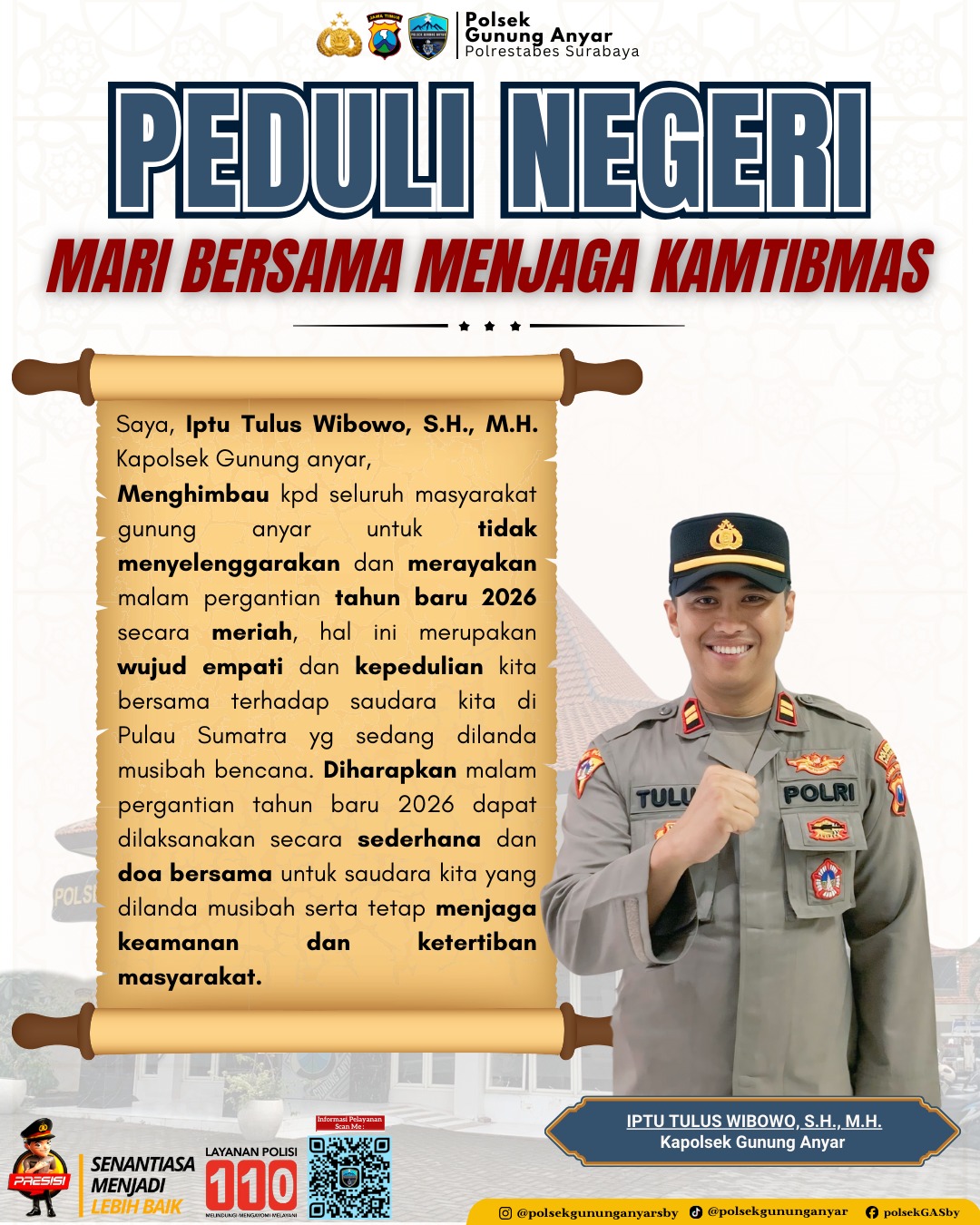 Dengan nuansa yang penuh kepedulian, beliau mengajak warga: “Mari kita ganti ledakan kembang api dengan bunyi dzikir yang penuh makna – jaga keheningan di wilayah hukum Gunung Anyar dan tunjukkan solidaritas kepada saudara kita di Sumatera yang tengah menghadapi bencana.”ujar Iptu Tulus Wibowo