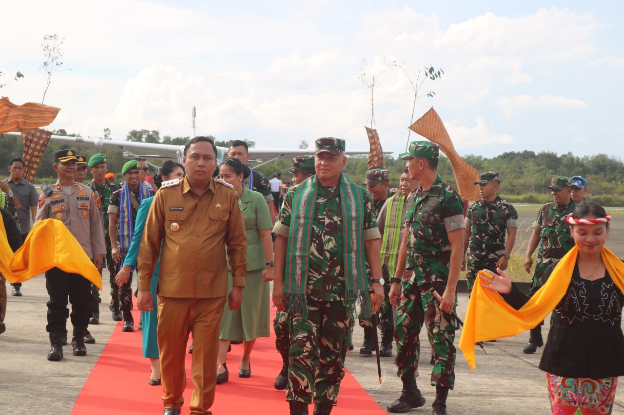 Setibanya di Bandara Melalan, Pangdam VI/Mulawarman disambut secara adat dan penuh kehangatan oleh jajaran Pemerintah Kabupaten Kutai Barat bersama Forkopimda. Prosesi penyambutan diawali dengan Tarian Selamat Datang, pengalungan Selendang Doyo, serta ritual adat Tepung Tawar sebagai bentuk penghormatan dan doa keselamatan bagi tamu kehormatan yang berkunjung ke Bumi Tanaa Purai Ngeriman.