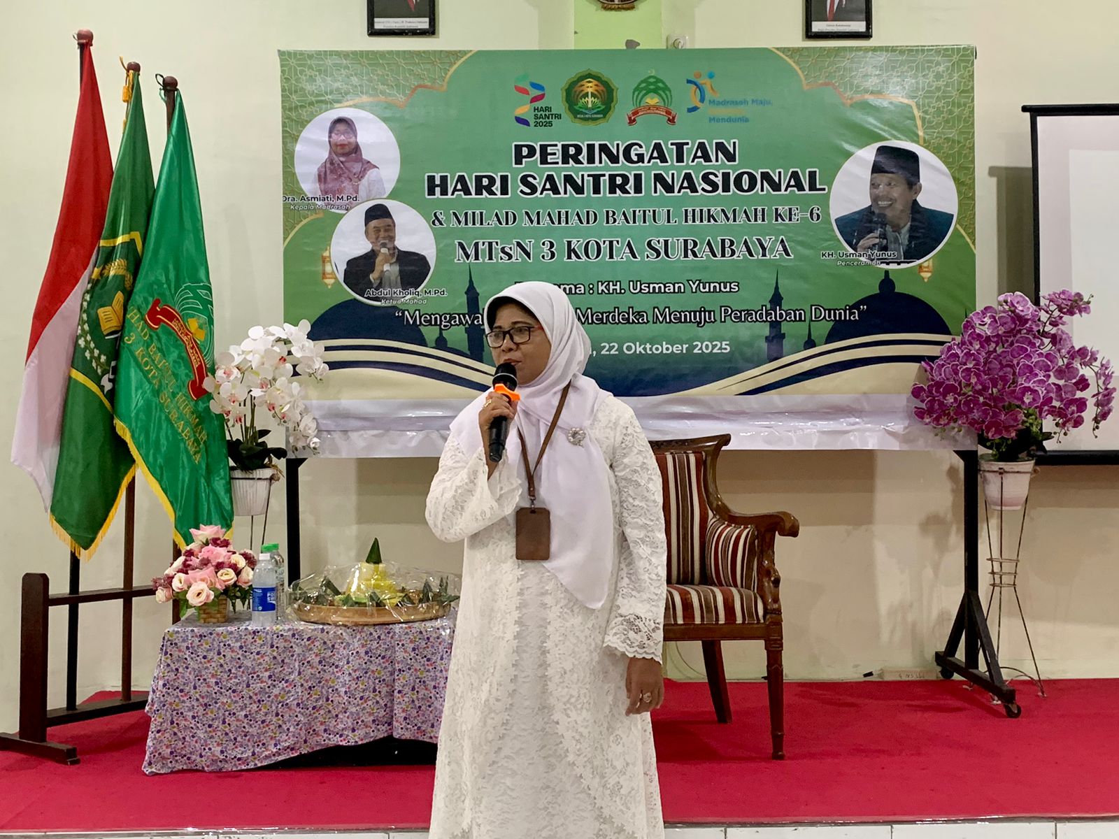 Faktanusa.com, Surabaya, Rabu (22 Oktober 2025 M / 30 Rabiul Akhir 1447 H), Suasana khidmat dan penuh semangat mewarnai peringatan Hari Santri Nasional yang dirangkaikan dengan Milad ke-6 Ma’had Baitul Hikmah MTsN 3 Kota Surabaya.