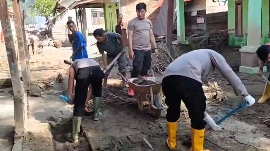 Banjir bandang yang melanda wilayah tersebut meninggalkan endapan lumpur dan serpihan material di sejumlah titik. Personel Polri bersama masyarakat bergotong royong membersihkan bagian dalam rumah, halaman, hingga akses jalan desa yang tertutup material banjir.