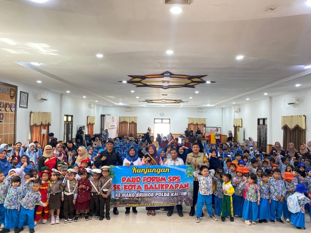 Faktanusa.com, Balikpapan – Suasana Mako Satuan Brimob Polda Kalimantan Timur (Kaltim) riuh dengan keceriaan anak-anak. Puluhan siswa dari Kelompok Bermain (KB) Imanul Wafa, yang tergabung dalam Forum Satuan PAUD Sejenis (SPS) Balikpapan, melaksanakan kunjungan edukasi ke markas Satuan Brimob pada hari Rabu, 15 Oktober 2025. Kegiatan “Polisi Sahabat Anak” ini bertujuan untuk menanamkan rasa cinta tanah air, disiplin, dan menghilangkan rasa takut anak terhadap sosok kepolisian sejak usia dini.